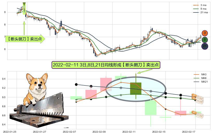 ⚀ 2022-02-11日显现 3日-8日-21日均线 【断头铡刀】卖出点 看空信号,后市看跌,卖出
