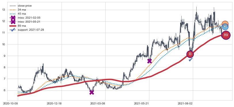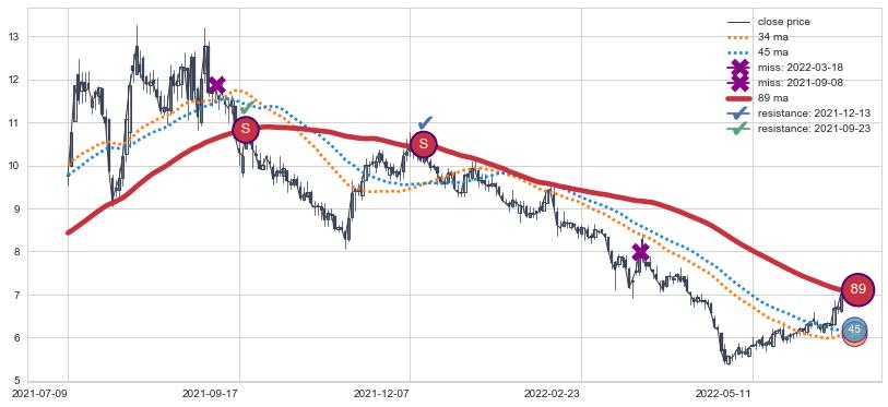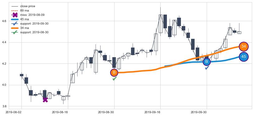 ➢ 最优均线组合共正确确认支撑阻力信号5处,正确确认率 50.00%