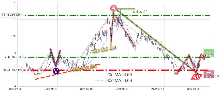 ♘ 阻力价格位7.47,可信任强度74.27%,距离最后交易2022-08-12形成的收盘价格7.10相差 +5.27%