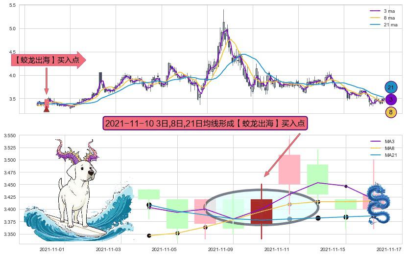 ⚀ 2021-11-10日显现 3日-8日-21日均线 【蛟龙出海】买入点 看多信号,后市看涨,买入