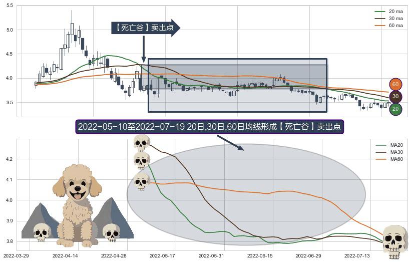 ⚀ 2022-05-11-日至2022-07-19-日显现 20日-30日-60日均线 【死亡谷】卖出点 看空信号,后市看跌,卖出