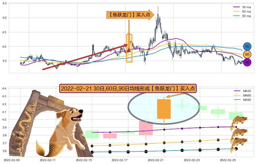 ⚀ 2022-02-21日显现 30日-60日-90日均线 【鱼跃龙门】买入点 看多信号,后市看涨,买入