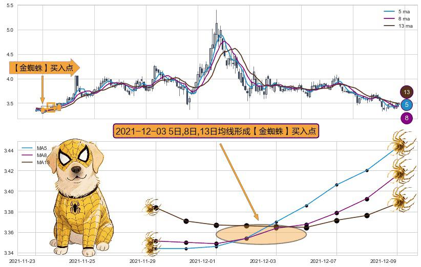 ⚀ 2021-12-03日显现 5日-8日-13日均线 【金蜘蛛】买入点 看多信号,后市看涨,买入