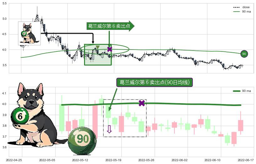 ⚀ 2022-05-17-日显现 葛兰威尔均线 90日均线 第⑥卖出点 走势反转见顶信号,后市看跌,卖出信号