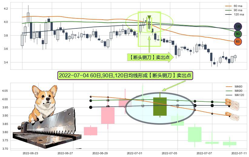 ⚀ 2022-07-04日显现 60日-90日-120日均线 【断头铡刀】卖出点 看空信号,后市看跌,卖出