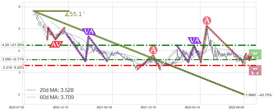 ♘ 阻力价格位3.595,可信任强度68.05%,距离最后交易2022-08-12形成的收盘价格3.500相差 +2.71%