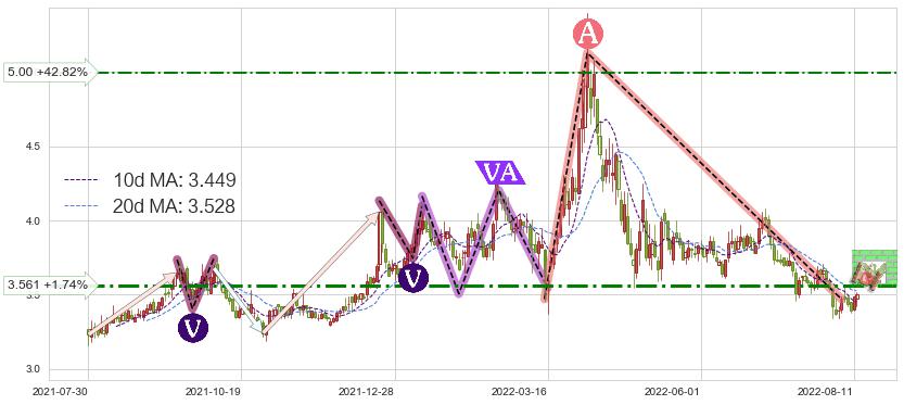 ♘ 阻力价格位3.561,可信任强度69.22%,距离最后交易2022-08-12形成的收盘价格3.500相差 +1.74%