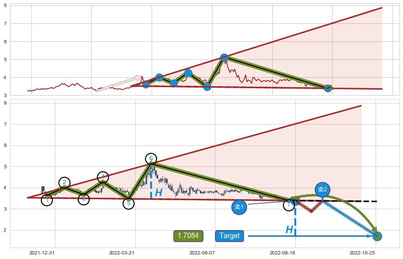 ➢ 最小反转跌幅→𝐇: 1.6712 (逐步抬高阻力斜边最后的阻力点⑥与支撑边垂直距离)