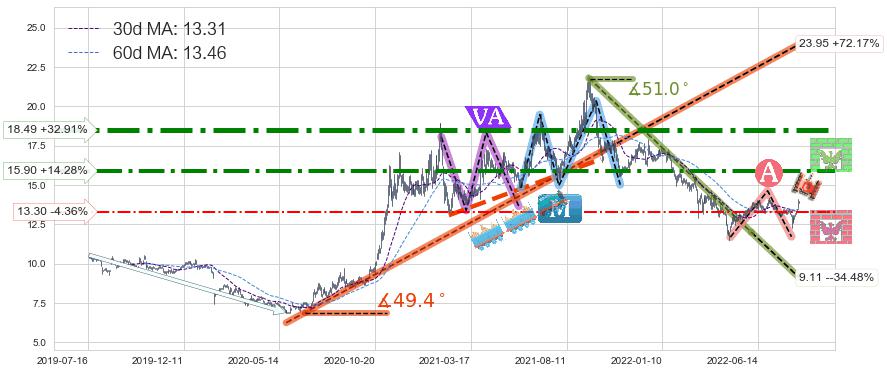 ♘ 阻力价格位15.90,可信任强度71.46%,距离最后交易2022-08-12形成的收盘价格13.91相差 +14.28%