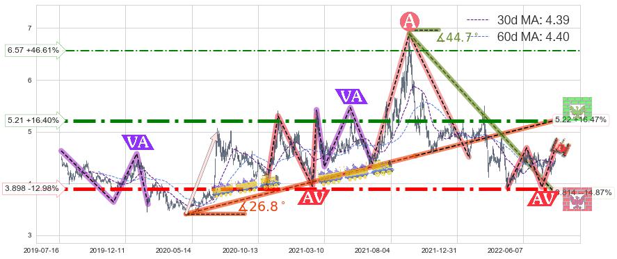 ♘ 阻力价格位6.57,可信任强度53.29%,距离最后交易2022-08-12形成的收盘价格4.48相差 +46.61%