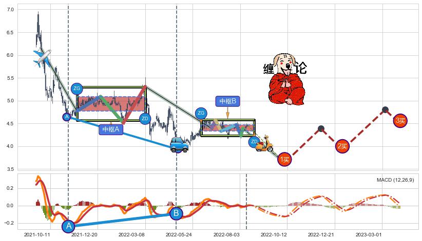 ➣ 【中枢A】:2021-11-18-2022-03-08,中枢由4笔构成,共73交易日, ZG=5.09, ZD=4.77