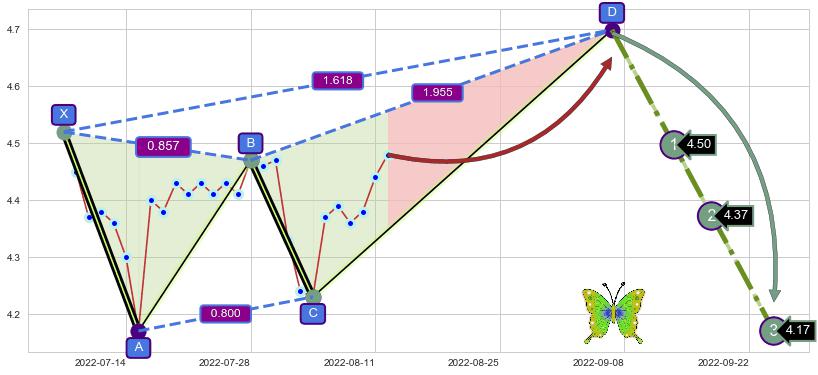 ➣ 未完成【蝴蝶】形态起点X: 2022-07-07, 已到达C点: 2022-08-04, 预测最终D点: 2022-09-07, 共45交易日