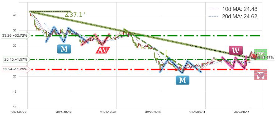♘ 阻力价格位25.45,可信任强度68.35%,距离最后交易2022-08-12形成的收盘价格25.06相差 +1.57%
