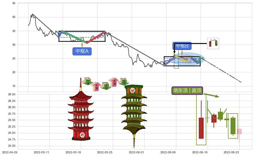 ➣ 【中枢B】:2022-05-24-2022-08-05,中枢由6笔构成,共53交易日, ZG=25.05, ZD=23.48