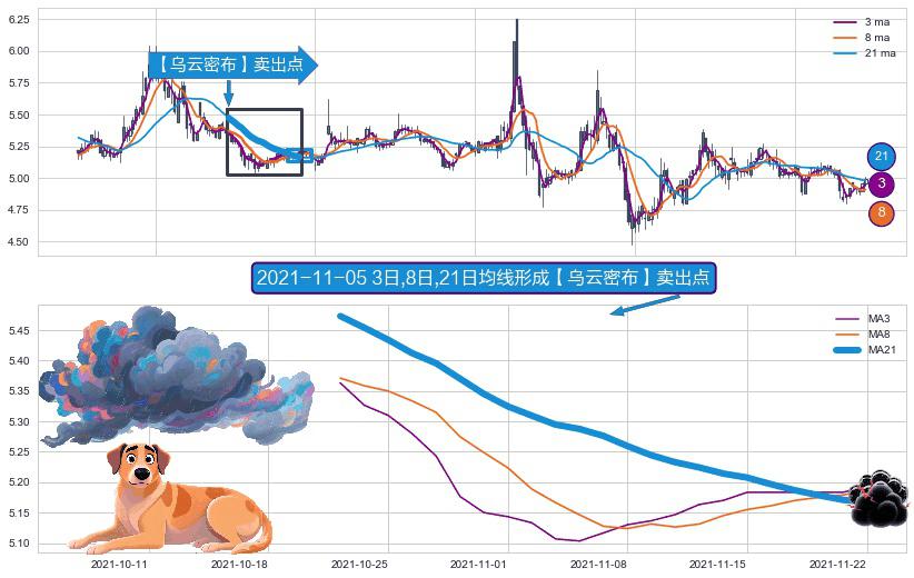 ⚀ 2021-10-21日-2021-11-22日显现 3日-8日-21日均线 【乌云密布】卖出点 看空信号,后市看跌,卖出