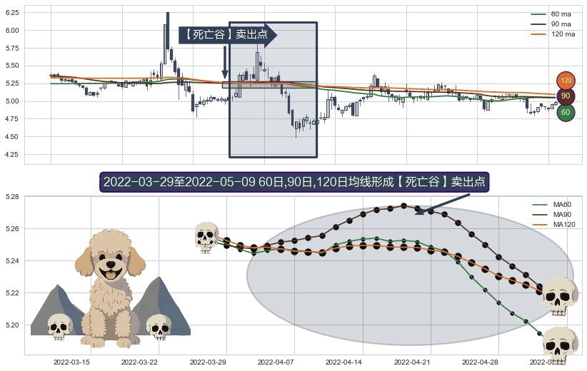 ⚀ 2022-03-30-日至2022-05-09-日显现 60日-90日-120日均线 【死亡谷】卖出点 看空信号,后市看跌,卖出
