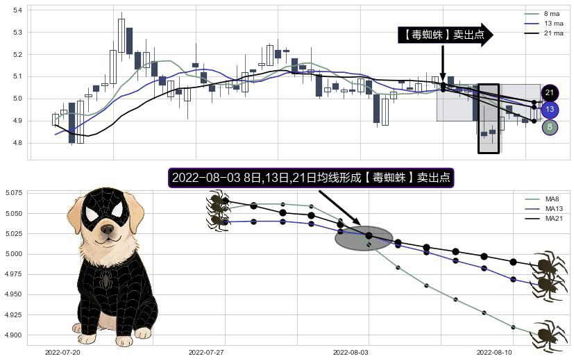 ⚀ 2022-08-03日显现 8日-13日-21日均线 【毒蜘蛛】卖出点 看空信号,后市看跌,卖出