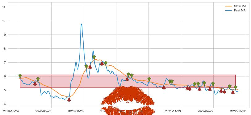 ⚅ 卖点向下突破均线后,价格走势很纠结,不断在均线周围试探,有再次上探突破均线的可能
