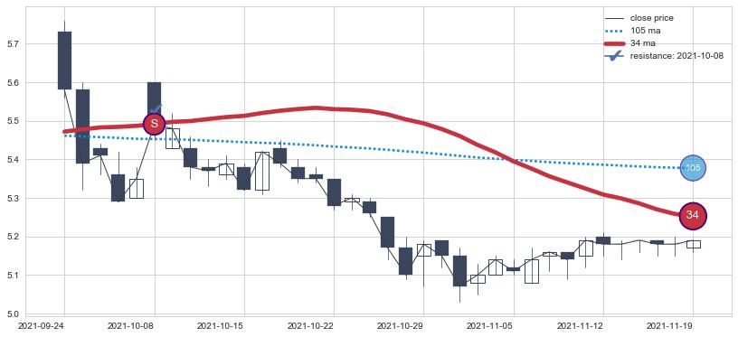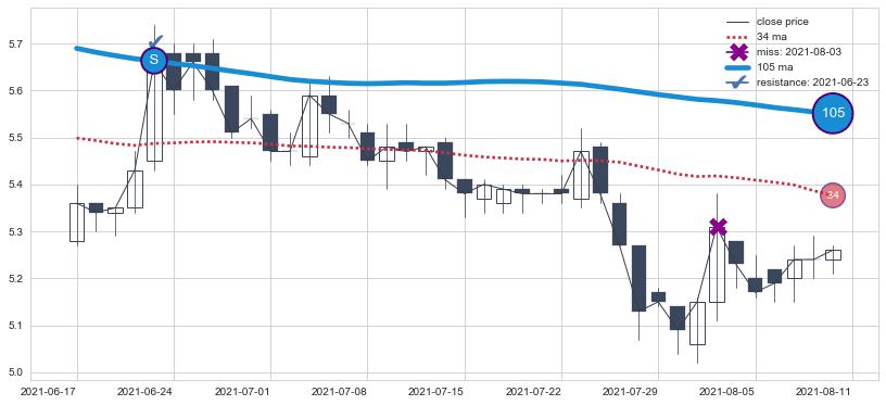 ⚁ MA3和MA8走势平行,且始终保持在短距离内,MA21始终在短中期均线上方,与短中期均线保持一定的距离,微微下行