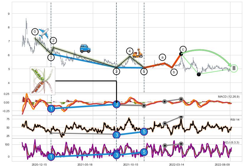 ➢ a,c调整浪MACD, RSI, KDJ走势都【未出现】背离,abc走势延续, 5浪反转概率增强