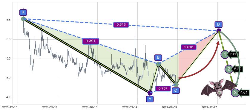 ➣ 未完成【蝙蝠】形态起点X: 2021-01-05, 已到达C点: 2022-08-03, 预测最终D点: 2022-12-30, 共490交易日