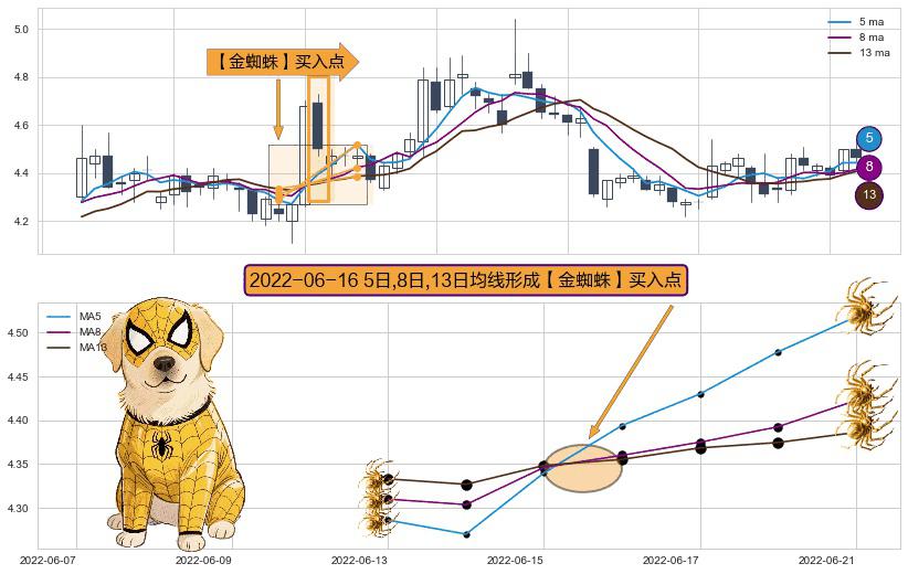 ⚀ 2022-06-16日显现 5日-8日-13日均线 【金蜘蛛】买入点 看多信号,后市看涨,买入