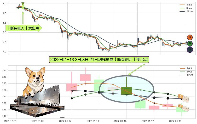 ⚀ 2022-01-13日显现 3日-8日-21日均线 【断头铡刀】卖出点 看空信号,后市看跌,卖出
