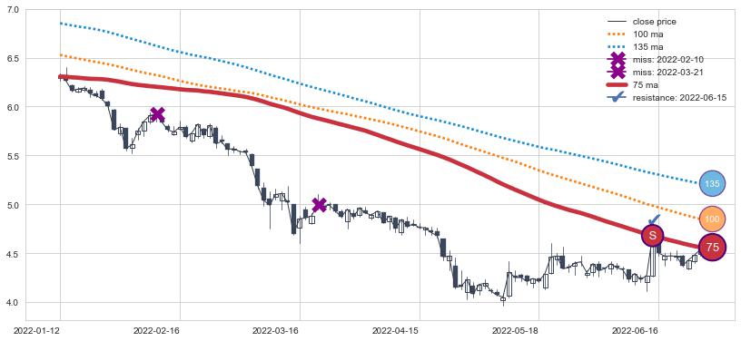 ⚂ 2022-07-15日开盘向下跳空低开-2.81%, 向下脱离整理形态,且收盘突破均线组合