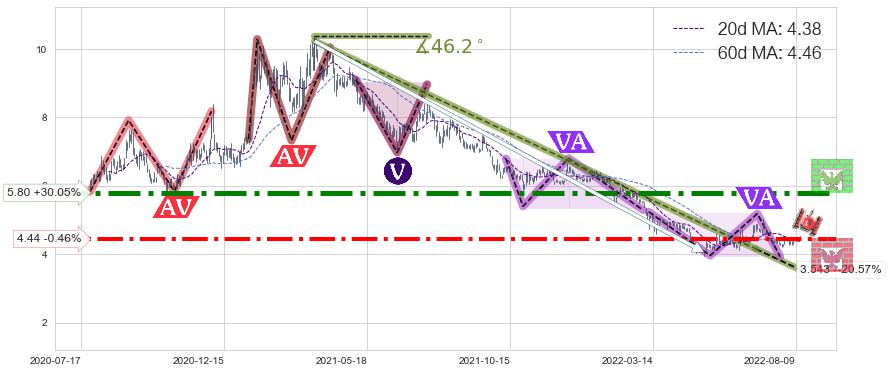 ♞ 20日均线:4.38,60日均线:4.46→ 快线<慢线