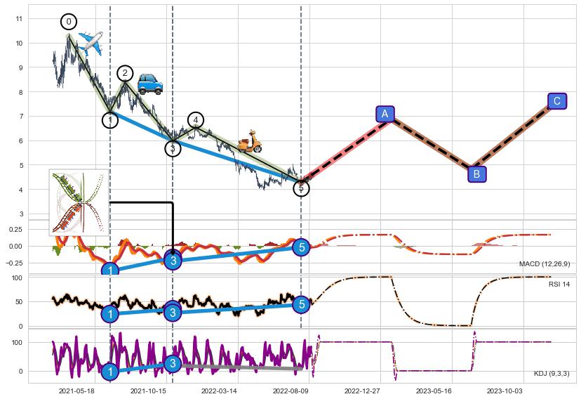 ➣ 1,3,5驱动浪MACD, RSI, KDJ走势都出现【常规背离】反转信号增强