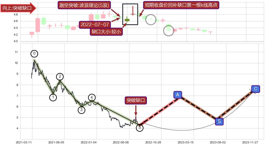➣ 突破缺口形成后,后续k已经超过14根,跳空突破波浪理论(5浪)关键点后, 出现【完全回踩】迹象,短期收盘价回补缺口第一根k线低点