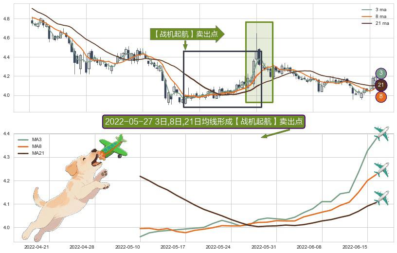 ⚀ 2022-05-10日-2022-06-16日显现 3日-8日-21日均线 【战机起航】卖出点 看空信号,后市看跌,卖出