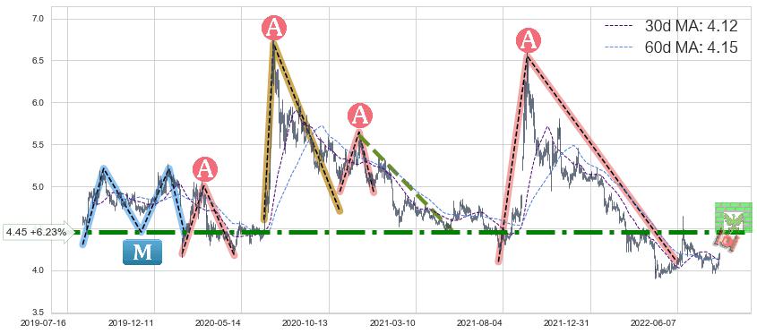 2022-06-15: 第一阻力位4.45强力阻拦了上升趋势,成功阻止了价格的继续上涨。
