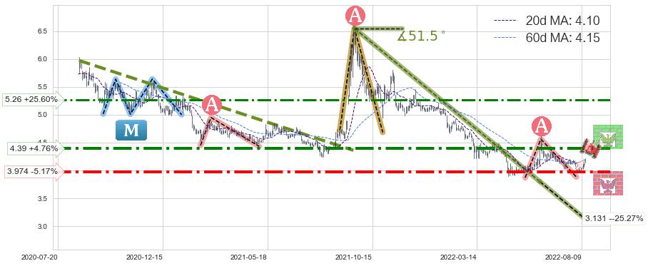 ♘ 阻力价格位4.39,可信任强度82.71%,距离最后交易2022-08-12形成的收盘价格4.19相差 +4.76%