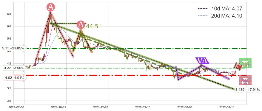 ♘ 阻力价格位4.32,可信任强度45.09%,距离最后交易2022-08-12形成的收盘价格4.19相差 +3.00%