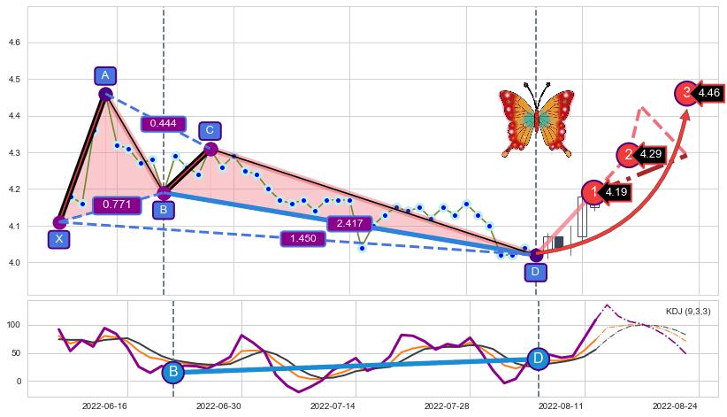 ➣ 已完成【蝴蝶】形态起点X: 2022-06-09, 终点D: 2022-08-05, 共42交易日