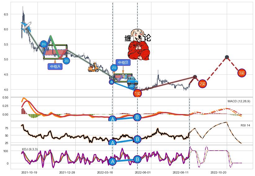 ➣ 【中枢B】:2022-03-25-2022-04-12,中枢由4笔构成,共11交易日, ZG=4.47, ZD=4.36
