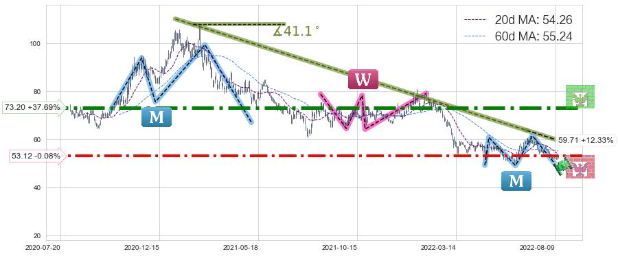 ♘ 在最后的下跌阶段2021-01-07至2022-06-29,存在 持续未破位的阻力位 ,阻力价格59.71,可信任强度81.01%,其距离最后价格53.16相差 +12.33%