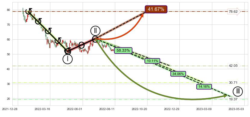 ➣ 调整浪已超过预测的c点位置,后续大趋势循环浪继续下跌概率58.33%,谨慎做多