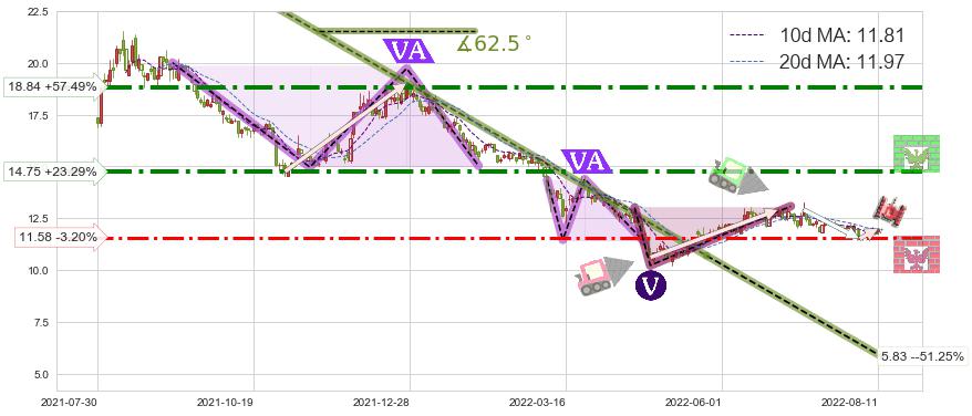 ♘ 阻力价格位14.75,可信任强度78.01%,距离最后交易2022-08-12形成的收盘价格11.96相差 +23.29%