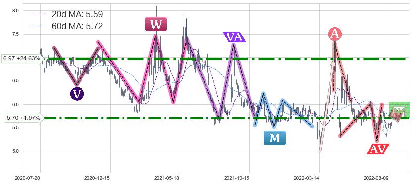 ♘ 阻力价格位5.70,可信任强度72.34%,距离最后交易2022-08-12形成的收盘价格5.59相差 +1.97%
