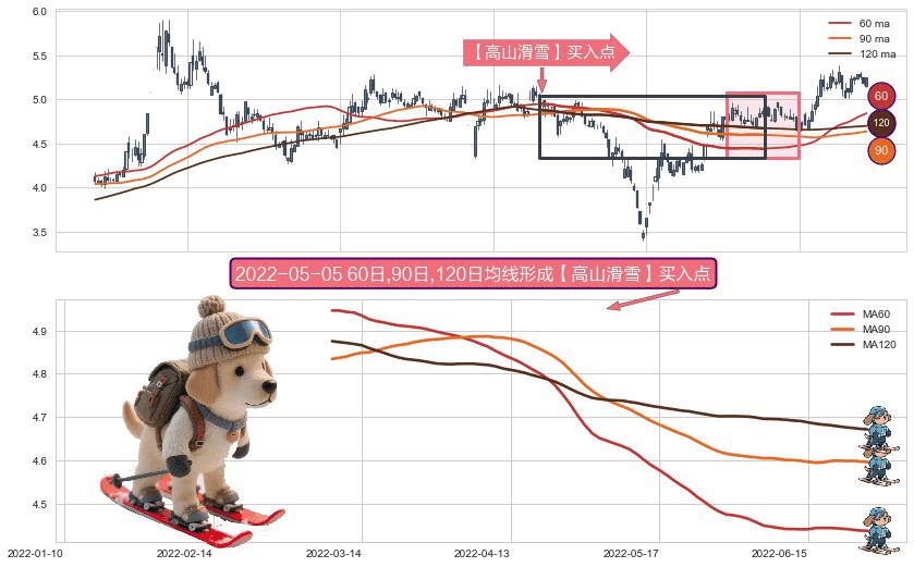 形态多维评估: ⚀ 2022-03-08日-2022-06-27日显现 60日-90日-120日均线 【高山滑雪】买入点 看多信号,后市看涨,买入