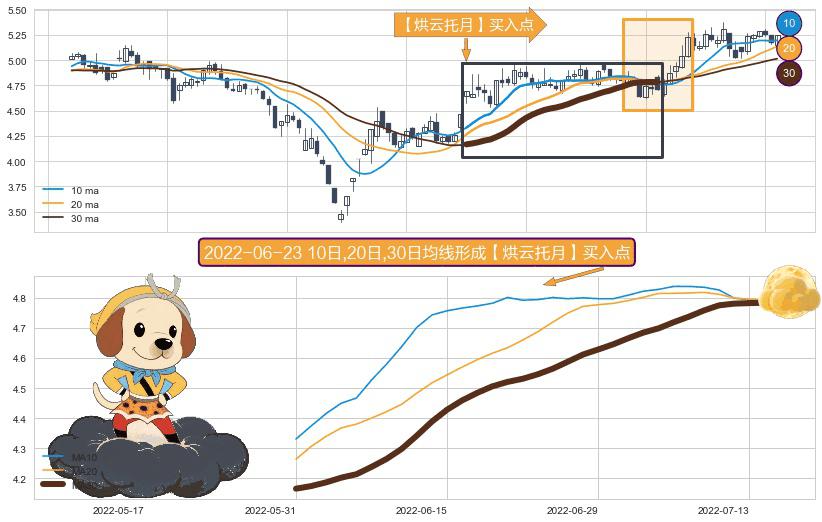 形态多维评估: ⚀ 2022-05-31日-2022-07-15日显现 10日-20日-30日均线 【烘云托月】买入点 看多信号,后市看涨,买入