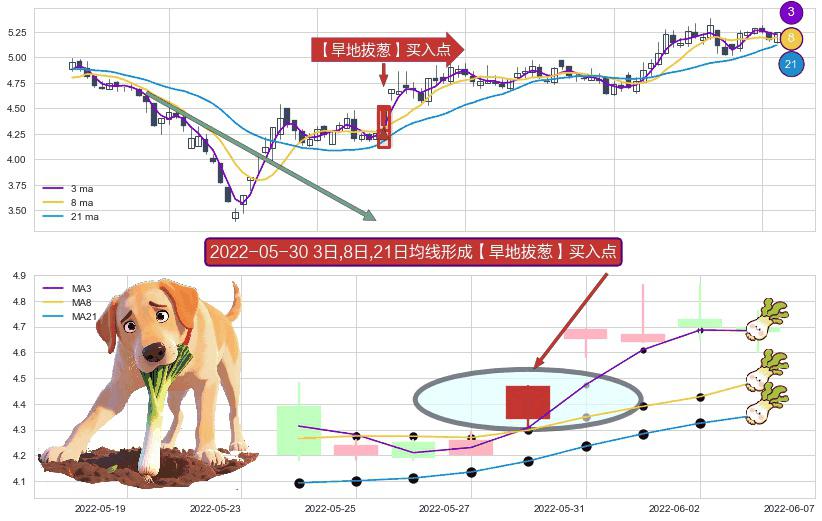 形态多维评估: ⚀ 2022-05-30日显现 3日-8日-21日均线 【旱地拔葱】买入点 看多信号,后市看涨,买入