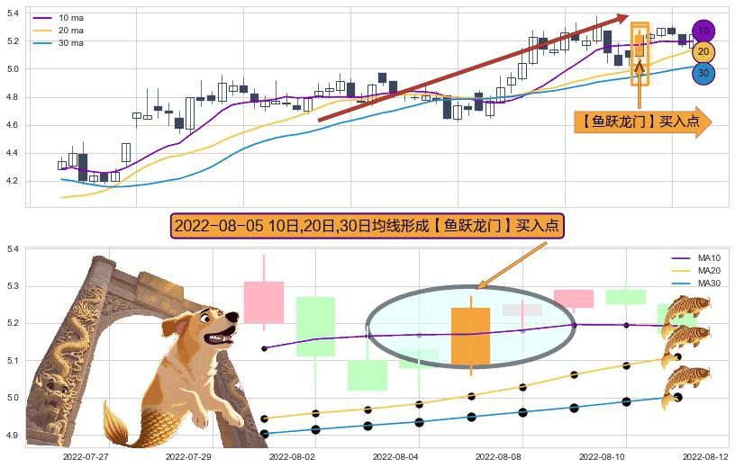 形态多维评估: ⚀ 2022-08-05日显现 10日-20日-30日均线 【鱼跃龙门】买入点 看多信号,后市看涨,买入