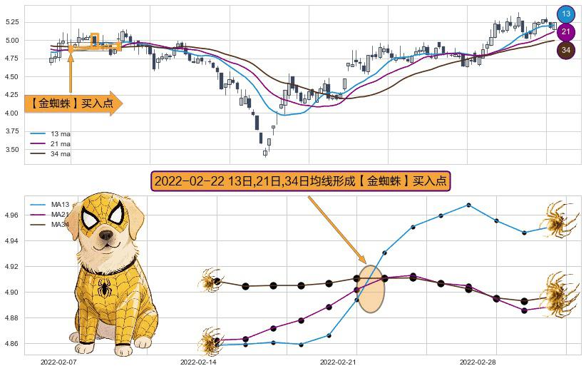 形态多维评估: ⚀ 2022-02-22日显现 13日-21日-34日均线 【金蜘蛛】买入点 看多信号,后市看涨,买入