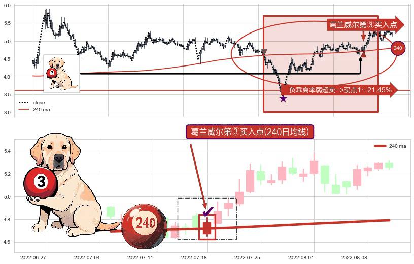 形态多维评估: ⚀ 2022-07-18-日显现 葛兰威尔均线 240日均线 第③买入点 上升趋势的中继信号,后市看涨,买进信号