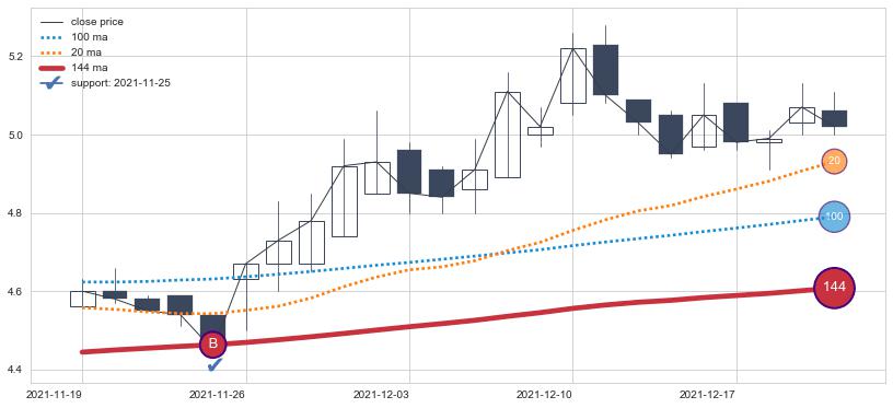 上涨趋势2021-11-19-2021-12-22,均线144确认关键支撑1处