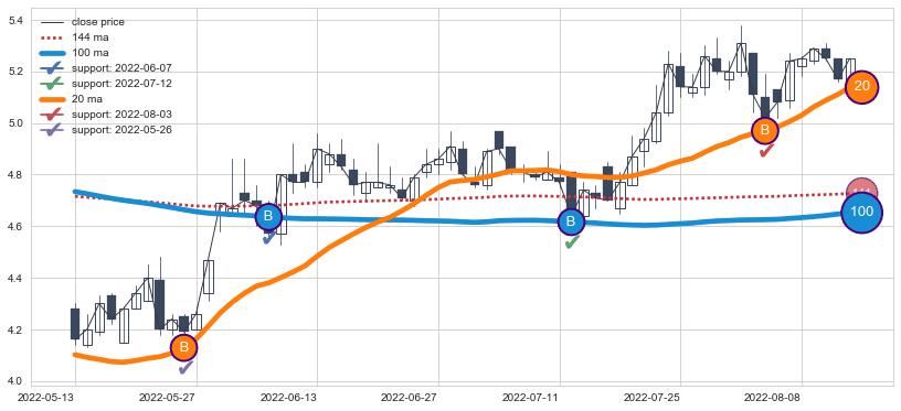 上涨趋势2022-05-13-2022-08-12,均线100, 20确认关键支撑4处