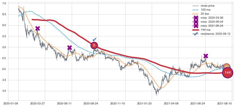 下跌趋势2020-01-09-2021-08-10,均线144确认关键阻力1处